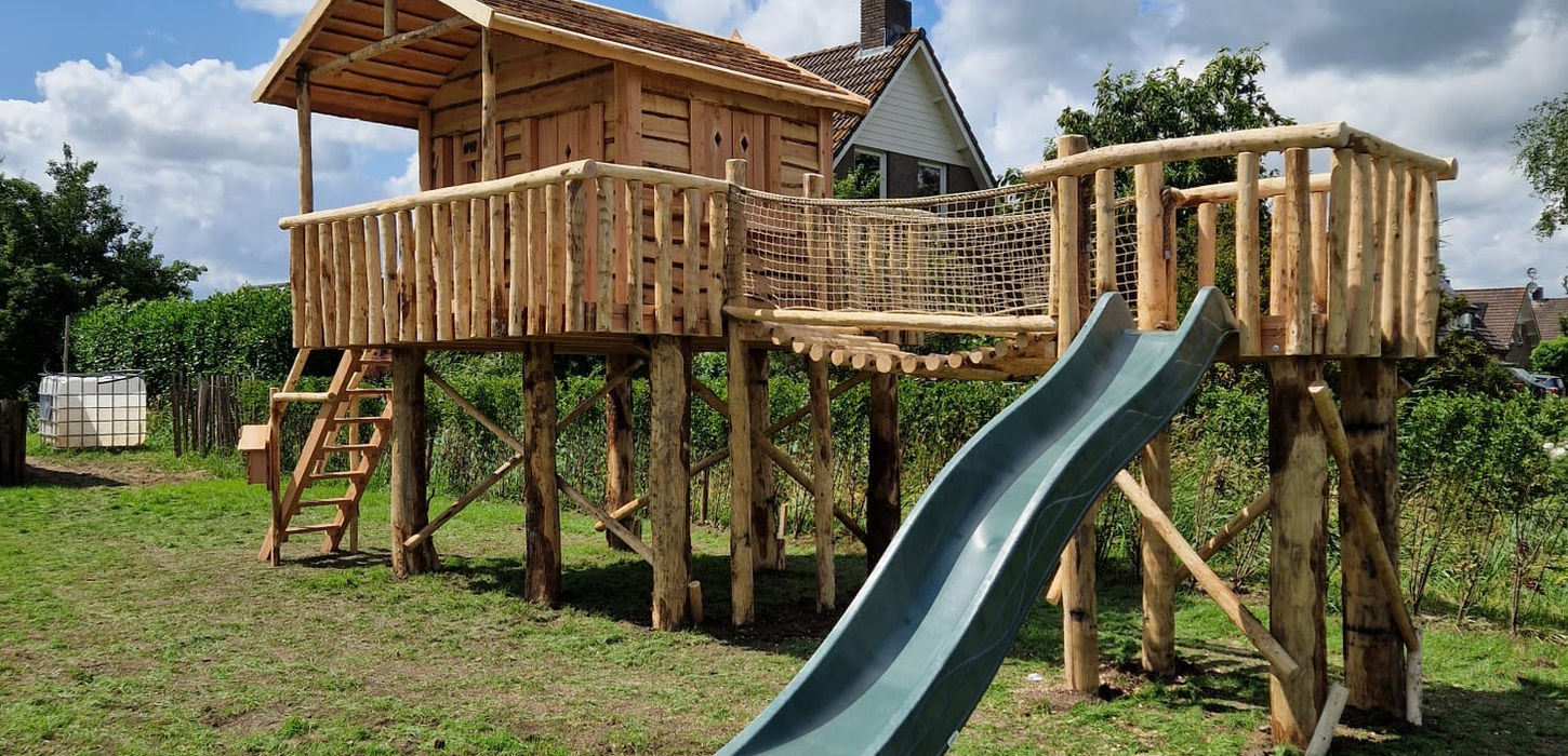 Stevig gebouwd, met natuurlijke materialen en een rustige uitstraling die mooi past in de tuin. Een robuust boomhut speelhuis met ruimte voor fantasie!